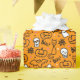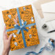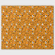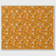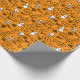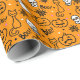 Papel embrulhando com um moderno design minimalista para o Halloween, um padrão de silhuetas de crânios, fantasmas, teias de sabugo, uma silhueta de gato, abóboras sobre fundo laranja.