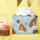 Cães Boxer bonitos sentam-se e posam-se com casacos brindle, branca e coroa, com ossos de cão espalhados e padrões de pegadas.