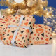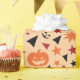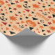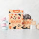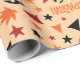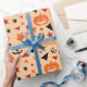 O "Papel de Embalagem Sem Costura: Abóbora, Estrelas e Folha" mostra abóboras e estrelas, com folhas coloridas e texto divertido do Dia das Bruxas, criando um presente confortável e festivo.