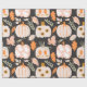 Fundo preto. Folhas e abóboras com fantasmas, crânios e flores