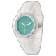 Um relógio branco do pulso esportivo, com um padrão de Bolinhas em azul deslumbrante, verde esmeralda e verde neon. Parte da coleção Posh & Painterly 'Blue Moons'; de um design de colagem de papel pintado à mão por Judy Adamson.