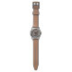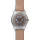 O teste padrão acolchoado "castelo" em marrom e em azul, é o fundo para a cara do relógio. Os numerais brancos são situados nas "torres e nos cantos" do castelo.