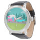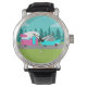 Este Retro Camper / Trailer and Car Watch apresenta um desenho animado moderno e minimalista de meio século que o deixará pronto para levar para a estrada aberta. Uma homenagem aos anos 50, este design apresenta um carro de turquesa vintage com o topo branco, puxando um trailer de viagem kitschy para seu destino final. O RV retrô perfeitamente restaurado tem uma metade rosa-quente inferior, metade superior branca, e um raio turquesa que separa os dois. A porta do lado da campista também é turquesa. O sotaque final é a asa rosa quente que se projeta a partir do fundo desta casa sobre rodas. Os campistas felizes estão dirigindo por uma estrada de cinza. A estrada está rodeada de relva verde e exuberante. Ao fundo, podemos ver as teais silhuetas de uma verdadeira floresta de árvores de cedro, contra um céu aqua com nuvens azuis fofas e leves. Esta design é perfeita para todos os hippies reformados, hipsteres que fogem, ou qualquer um que queira reviver algumas memórias de infância excelente. A melhor parte é que ninguém está perguntando, "Nós já estamos lá?"