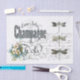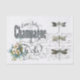 Lindas libélulas vintages, vindas de caligrafia francesa, tipografia de excelente de um anúncio de champanhe francês e um pequeno nódulo floral azul e amarelo de pansias vintage e nãos-me-esqueçam fazem um elegante papel de tecidos em francês e natural para acondicionamento de presentes ou carrinhos e decoupage.