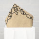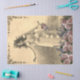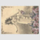 Papel tecidular com imagem antiga de uma mulher admirando rosas cor-de-rosa com um buquê na mão.