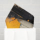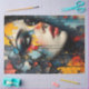 Papel de decoupage de rosto de mulher grafitada abstrata apresentando um retrato feminino em close-up sobreposto a uma textura de madeira rachada com respingos ousados de tinta vermelha, amarela, azul e preta. O design combina arte de rua, estilo de grafite urbana e textura desgastada para uma aparência dramática de mídia mista.