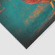 Papel tecidular com imagem de um galo colorido contra fundo azul de tijolo.