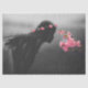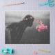 Papel de tecido dotado com a imagem de uma jovem com uma flor no cabelo e admirando um monte de flores rosa contra um fundo preto e branco.