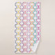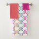 Este conjunto de toalhas tem um pano de lavagem roxo/rosa, uma toalha de rosa, e uma toalha de banho com um design de cor laranja, turquesa, rosa, azul, roxo e meio círculo amarelo com linhas num campo de branco.