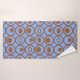 Este conjunto de toalhas tem um pano de lavagem azul claro, uma toalha marrom da mão e uma toalha de banho com um design geométrico de círculos em filas com círculos ou ovais dentro em castanho num campo azul.