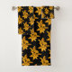 Estas toalhas de banho bonito apresentam um padrão repetitivo de dois lírios asiáticos amarelos ouros contra um fundo preto puro.
