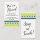 Mantenha seus amigos e familiares atualizados com seu novo endereço usando esses cartões de compartimento coloridos e ousados. Os destaques da tipografia versátil leem "Nós nos movemos" na frente e "Fique em contato!" centrados no verso, usando uma fonte moderna e casual. Nas extremidades opostas de cada lado adicionei gráficos de sotaque com riscas brilhantes e pontilhadas. A paleta nesses gráficos bonito inclui verde limão, azul de ovo do robin, cinzas escuras e branco. Use os campos modelo para adicionar todos os seus detalhes exclusivos e personalizar este design para seu próprio uso. Todo texto é renderizado em cinzas escuras correspondentes e as fontes podem ser alteradas se você quiser editar o design. // Concebida por Melody Watson para Paper Muserie.