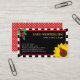 Mãe bonita chamando cartão para seus shows com seu nome em letras grandes em letras grandes em amarelo, e suas informações de contato em uma fonte branca divertida. Adicione os nomes dos seus filhos a um roteiro encantador. Tudo contra um fundo preto enquadrado por uma borda vermelha e listras pretas e brancas. Uma joaninha senta-se num girassol amarelo brilhante num canto, e outra joaninha senta-se num galho verde de folhas no canto oposto. A parte traseira apresenta bolinhas vermelhas e brancas.