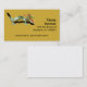 Dragão com escamas verdes e brancas no corpo, ouro e espinhos vermelhos na cabeça, língua vermelha. Imagem no canto superior esquerdo. Alinhados do lado direito estão o nome pessoal, o nome comercial e o endereço. Na parte inferior estão vários números de contato (telefone, e-mail, etc.). A cor de fundo é ouro.