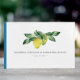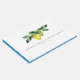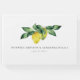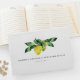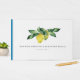 Convide seus convidados de casamento para compartilhar seus desejos e sabedoria com este livro de convidados botânicos com limões aquosos e folhas em tons de amarelo e verde. Seus nomes e data de casamento aparecem em letras clássicas. O livro reverte para uma cor azul sólida do Mykonos. Para ver mais designs de casamento botânicos visite www.zazzle.com/dotellabelle
