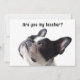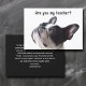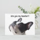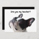 Boston Terrier de volta à escola, cartões de boas-vindas da professora. Um lindo Boston Terrier na frente está olhando para cima. O texto de exemplo é "Você é meu professor?". Adicione sua mensagem pessoal aos estudantes no verso usando texto branco impresso sobre preto. Escolha a opção impressa ou descarregável.