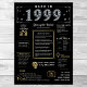 Voltemos a 1999 com a nossa cativante poster de aniversário digital, repleta de fatos históricos, eventos significativos e narrativas encantadoras do passado. Adorado com ouro elegante e sotaque prateado contra um pano de fundo preto impressionante, este poster de aniversário expele o charme do eterno. Nosso poster de aniversário fornece um fascinante vislumbre de 1999, explorando facetas como renda média, invenções notáveis, ocorrências significativas, tendências da moda e expressões coloquiais da era. Destaca momentos fulcrais como a bolha Dot-Com, a ascensão de bandas de rapazes, o surgimento de Internet discada e a preocupação generalizada com o Y2K. Invenções proeminentes como a World Wide Web, mensagens de texto, tecnologia MP3 e a câmera digital são mostradas de forma proeminente, refletindo o notável progresso tecnológico da era. No geral, o poster de aniversário encapsula a essência da vida na década de 1990, capturando tanto a inovação tecnológica quanto os fenômenos culturais como a música e a moda. Ela serve como um início de conversa engajante em celebrações de aniversário e aniversários, e quando elegantemente enquadrado, ela se transforma em uma lembrança estimada, preservando o espírito dos tempos para as gerações futuras.