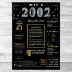 Tome uma jornada de volta a 2002 com nosso cativante poster de aniversário digital, repleta de fatos históricos, eventos significativos e narrativas cativantes do passado. Adorado com ouro elegante e sotaque prateado contra um pano de fundo preto impressionante, este poster de aniversário irradia o charme do eterno. Nosso poster de aniversário oferece uma espiada intrigante em 2002, mergulhando em aspectos como renda média, invenções notáveis, ocorrências significativas, tendências da moda e expressões coloquiais da era. Destaca momentos-chave como o advento das plataformas de mídia social, a onda de TV real e o surgimento de serviços de transmissão contínua. Invenções como smartphones, telefones com câmera e carros híbridos ganham palco central, refletindo os notáveis avanços tecnológicos da era. No geral, o poster capta a essência da vida nos anos 2000, encapotando tanto a inovação tecnológica quanto os fenômenos culturais como a música e a moda. Serve como um começo de conversa cativante em comemorações de aniversário e aniversários, e quando elegantemente enquadrado, evolui para uma lembrança apreciada, preservando o espírito dos tempos para as gerações vindouras.