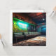 Postar prédio apocalíptico abandonado com grafite verde e fileira de assentos vazios. Decaimento urbano, espaços perdidos, arte aérea.
