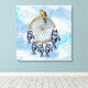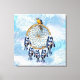 Um apanhador de sonhos que inclui o círculo redondo de bambu e miçangas vermelhas na teia com penas de pássaro exótico azul em um fundo de pena de blues macio.