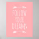 Este pôster inspirador com a citação "Siga seus sonhos" apresenta tipografia branca e uma seta desenhada à mão em rosa discreto.