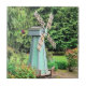 Um moinho verde muito bonito como decoração em um jardim. Foto de abril de 2019 em Woodburn, Oregon.