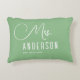 O design mostra uma almofada elegante em verde sálvia e branco. Um belo texto "mrs" único em caligrafia caprichosa no topo e um sobrenome e data personalizáveis na parte inferior. O design é extremamente único e clássico e será um item elegante para dar a qualquer noiva ou recém-casada como presente