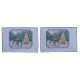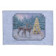 Um galo branco e um pombo estão numa clareira cercada por uma floresta de pinheiro e de abeto, seus galhos pesados com neve. No meio da clareira está uma árvore de Natal decorada com luzes quentes de férias brilhando pela neve para iluminar a noite escura de inverno. Trabalho de arte realista criada de uma pintura original de petróleo pelo artista da vida selvagem Crista S. Forest.