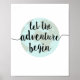 "Deixe a aventura começar." Palavras inspiradoras para viver, esta mensagem lembra-nos de que esperamos ansiosamente pelo que está por vir e não nos aprofundaremos no passado. A caligrafia escrita à mão num texto preto clássico contra um mundo estilizado num fundo branco funciona com qualquer decoração, dormitório ou quarto de criança.