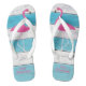 " Deixe-nos Flamingle", escrito em um roteiro do rosa do divertimento, e os flamingos cor-de-rosa brilhantes decoram estes chinelos summery em uma turquesa e em um fundo listrado branco, fazendo os perfeitos para a praia ou todo o lugar summery.