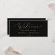 Este delicado cabeçalho de boas-vindas de um assento preto de ouro é perfeito para um casamento moderno. A design romântica minimalista apresenta uma magnífica e elegante tipografia amarela ouro champanhe num fundo preto com um aspecto simples e limpo. A placa impressão na frente e atrás (lado duplo). Verifique a coleção de placas de números de tabela de coordenação.