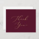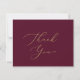 Este delicado cartões de agradecimentos de hambúrgueres com caligrafia de ouro é perfeito para um casamento moderno. A design romântica minimalista apresenta uma magnífica e elegante tipografia amarela ouro champanhe num fundo vermelho burgundy com um aspecto simples e limpo. Personalize a parte traseira do cartão com seus nomes e uma mensagem de obrigado. Como alternativa, deixe o vazio da seção modelo da mensagem do obrigado para escrever uma nota personalizada em cada cartão após a sua chegada. Essas cartas podem ser usadas para um casamento, chá de panela ou qualquer evento especial.