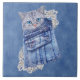 Gráficos de textura Denim decorados com rendas de creme branco para amantes de gatos com bolsos de jean e gatinhos azuis, verdes e de olhos castanhos