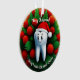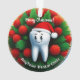 Este dente bonito veste um boné de Papais noeis e sorri sobre um fundo vermelho e verde.