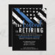 Este design apresenta uma bandeira da polícia com listras pretas e brancas, e uma fina faixa azul de linha também. O texto "A lenda está se aposentando" se senta acima de todos os detalhes partidários para os detalhes do polícia aposentado, xerife, capitão ou chefe do partido aposentado.