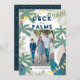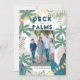 Este cartão com fotos de Natal "convés as palmeiras" apresenta luzes de férias, palmeiras e folhas tropicais sobre fundo branco. O verso apresenta um fundo azul marinho com padrões brancos de neve. Personalize-o para as suas necessidades. Você pode encontrar produtos correspondentes na minha loja.