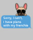 Esta camisola engraçada e frágil apresenta um bonito cachorrinho francês com uma mensagem de texto que diz "Desculpe, eu não posso, eu tenho planos com minha frenchida." Esta camisola fofa também está disponível com diferentes Buldogues franceses de cor diferente em designs masculinos e femininos.