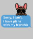 Esta camisola engraçada apresenta uma linda moça francesa marrom com uma mensagem de texto que diz "Desculpe, não posso, tenho planos com minha frenchida." Esta camisola fofa também está disponível com diferentes Buldogues franceses de cor diferente em designs masculinos e femininos.
