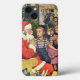 Ilustração antiga de Natal com uma família visitando o Papai Noel em meio a uma multidão no shopping. A criança está sentada no colo de Papai Noel e prestes a sussurrar sua lista secreta de desejos de Natal para o alegre São Nicolau. O pai está segurando presentes embrulhados e há um saco de brinquedos ao lado de Papai Noel para dar às crianças como presentes. Ho, Ho, Ho !