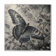 Borboleta preta e branca com galhos de árvores e folhas desenhando.
