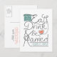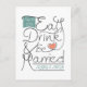 Desenho de convite de casamento para salvar a data de uma ocasião especial. Letras divertidas com elementos de design adicionais dizendo: Coma, beba e case. O formato de coração está incluído para enfatizar o romance.