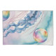 Uma ilustração em estilo aquarela de uma grande medusa rosa e azul com longos tentáculos fluidos contra um fundo pastel suave. A medusa tem um guarda-chuva em forma de sino translúcido rosa e tentáculos azul claro com ondulações e ondas sutis. Quatro bolhas coloridas com cores de arco-íris flutuam no fundo, cada uma mostrando um gradiente de cores rosa, amarelo e azul com uma aparência brilhante e semelhante a sabão. O fundo apresenta um gradiente suave de turquesa claro a roxo pálido, com texturas de pinceladas suaves criando uma atmosfera sonhadora submarina. A ilustração tem uma qualidade delicada e etérea com sangramentos e respingos sutis de aquarela em torno das bordas da composição. Os tentáculos da medusa criam curvas e ondas graciosas enquanto se arrastam atrás do corpo principal, renderizados em