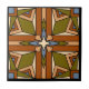 Este azulejo apresenta um belo design geométrico em verde-azeitona, siena queimada, bege arenoso, creme e azul-céu profundo, esboçado em preto. Estes seriam fantásticos como uma barra invertida ou individualmente pendurados como arte de parede, ou poderiam até ser usados como um bonito descanso na cozinha.