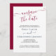 Simples e Elegante Guardar a Data, Atualização de Casamento para notificar os convidados do adiamento do casamento. O design está em branco, azul marinho e branco com elegantes letras de mão e fontes serif clássicas. O texto da amostra diz "Lamentamos anunciar que, devido a acontecimentos recentes, o casamento de [seus nomes] foi adiado. Iremos informá-lo assim que estabelecermos uma nova data. Foi uma decisão difícil e nós o obrigados pela sua compreensão". O modelo está configurado para que você adicione seus nomes e edite o máximo de contas de adiamento que desejar.
