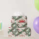 O papel de embrulho festivo mostra um carro vermelho vintage cercado por galhos de pínus e ornamentos vermelhos brilhantes, criando uma atmosfera alegre perfeita para comemorações de Natal.