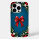 Design festivo, de fim de ano, com um rico fundo azul, emoldurado por folhas sagradas e verdes. Os cantos são enfeitados com uma série de decorações de Natal, incluindo borbulhas brancas e vermelhas brilhantes e aglomerados de bagas vermelhas. No centro, há um arco vermelho brilhante e proeminente que acrescenta um ponto focal marcante à composição. A estética geral é alegre e vibrante, evocando um sentimento de celebração e espírito de feriado.