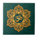 Um símbolo amarelo brilhante de Aum senta-se dentro de uma flor de lótus estilizado. O teste padrão circular é destacado para criar um brilho claro na superfície que se senta em um fundo profundo da cerceta. Seis folhas elegantes alcançam para fora do centro do design para criar um teste padrão simétrico bonito. Este design original do azulejo é uma representação impressionante deste símbolo espiritual.