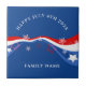 Uma bandeira abstrato americana com estrelas e listras em vermelho branco e azul. Feliz 4 de julho, texto personalizado e nome da família. Design patriótica moderna.