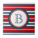 Design de temas náuticos com decoração em forma de monograma, em forma redonda, com ilustração em forma de corda sobre fundo listrado a azul, vermelho e branco