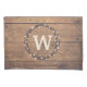 Design de monograma para Natal, com coroa e decoração de neve sobre fundo de madeira rústica
